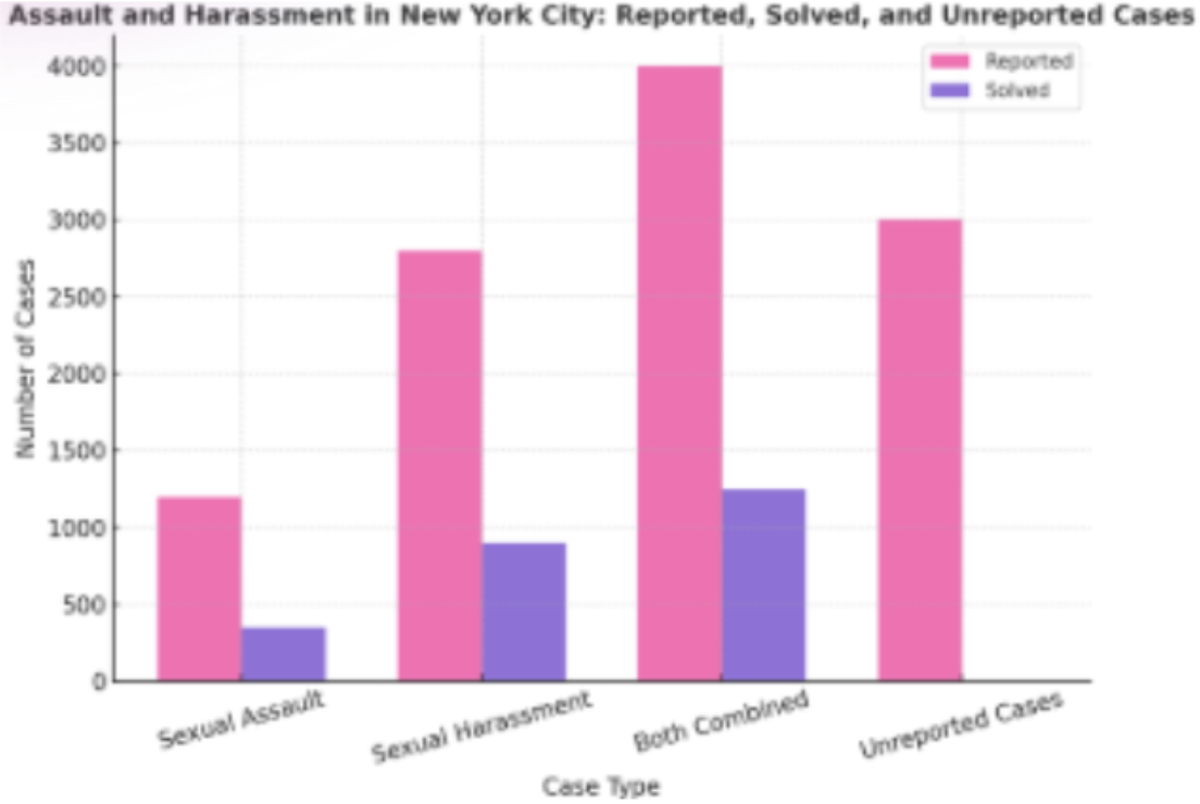 Recent data from the New York Police Department (NYPD) and national advocacy organizations such as RAIN (Rape, Abuse & Incest Network) reveal a continuous pattern. About 1 in 3 women and 1 in 6 men experience sexual violence at some point in their lives. In New York City, thousands of cases of sexual assault and harassment happen every year. However, studies estimate that about 60 to 80 percent of these incidents go unreported, which means many of these cases never reach authorities. According to the NYPD’s Special Victims Division, approximately 14,000 sexual assault incidents are investigated annually; these crimes include adults and minors. Yet fewer than half of these cases turn into arrests or resolutions, exposing the large gap between reports and justice received. Oftentimes, victims lose hope in a system that seems unable to protect them.